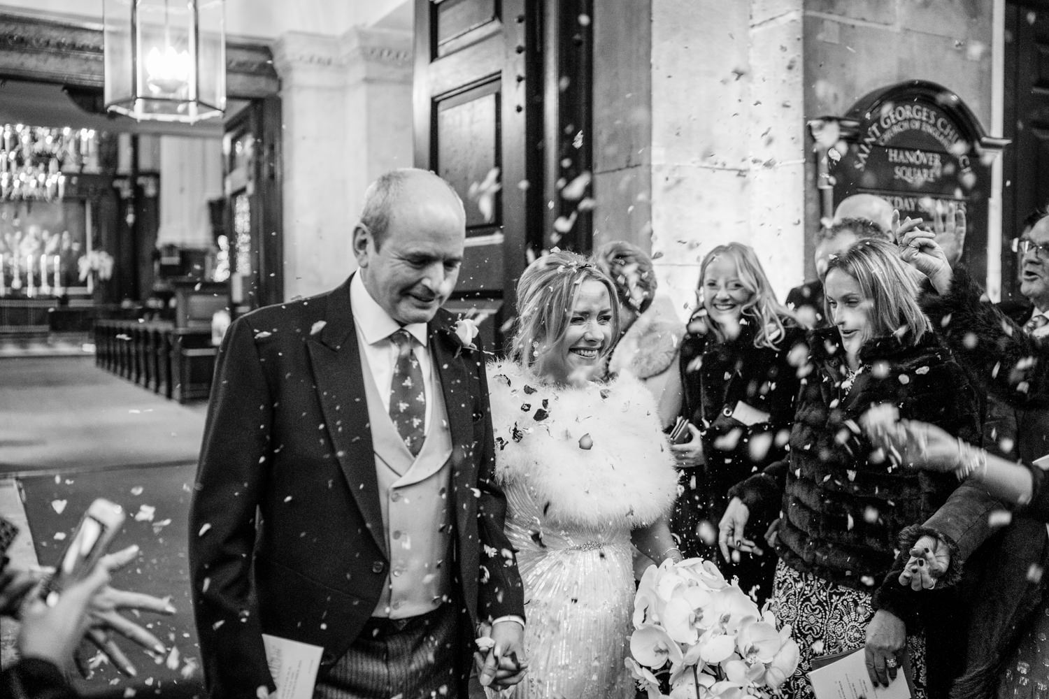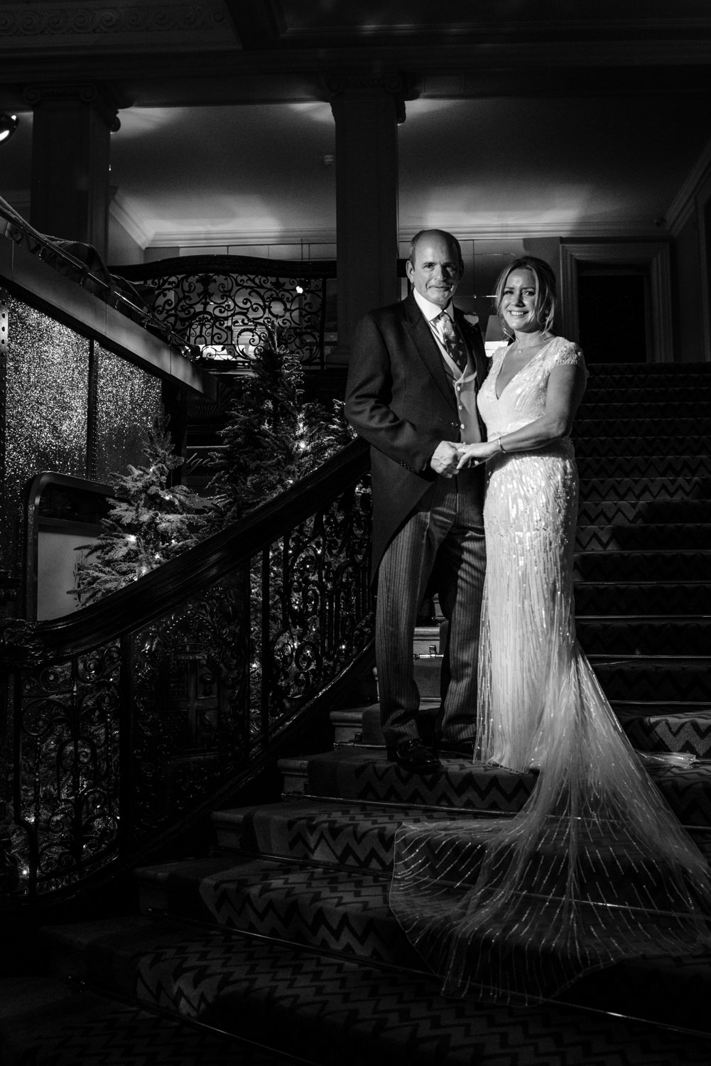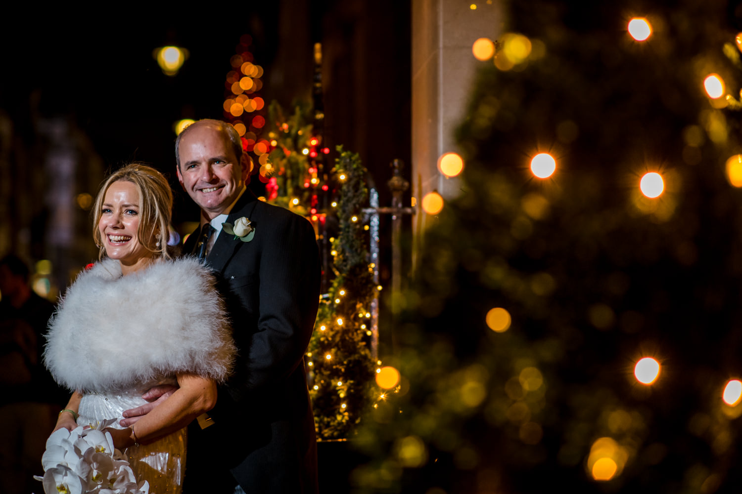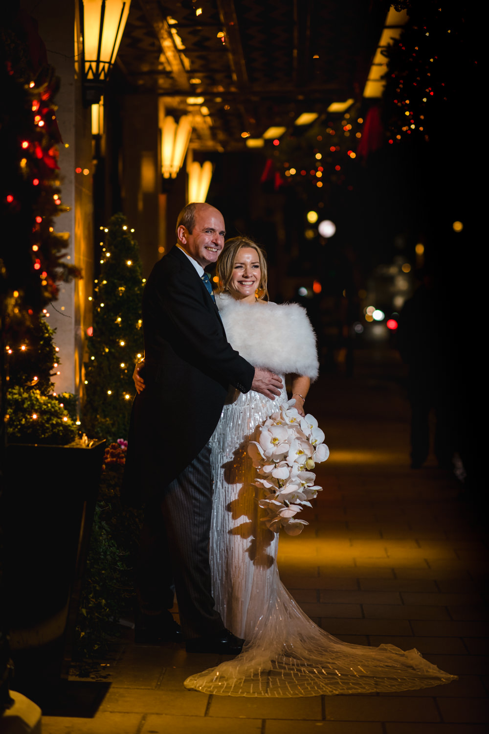 It was then time to return to the elegance of Claridge’s, where the rooms had been beautifully dressed with stunning floral arrangements by McQueens. The lobby and entrance were decorated for Christmas with beautiful warm golds and rich reds, it was a perfect backdrop for portraits, although we needed a avoid a very large sparkly red train that was attracting a lot of attention! We managed to work around it, though and then headed outside where I used some off-camera flash to light the couple. Winter weddings are wonderful, but they do require some additional lighting skills.