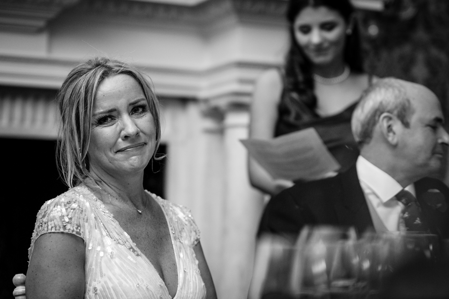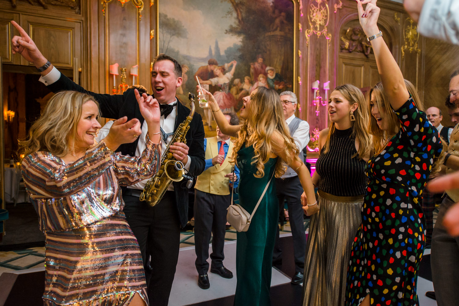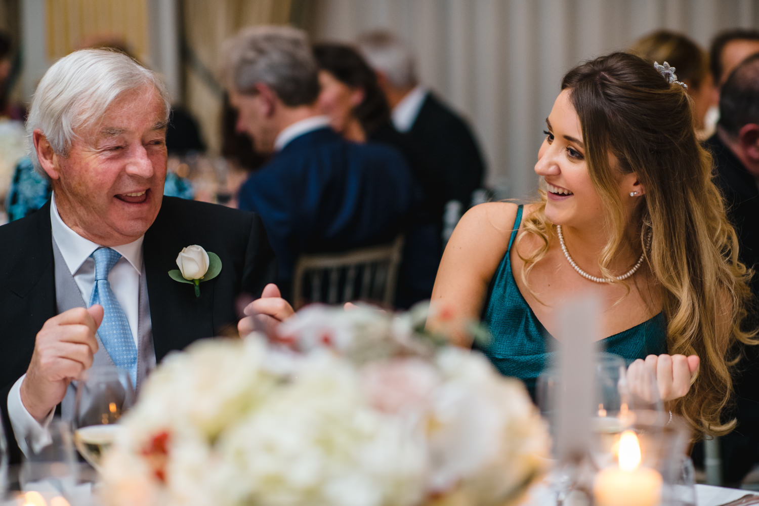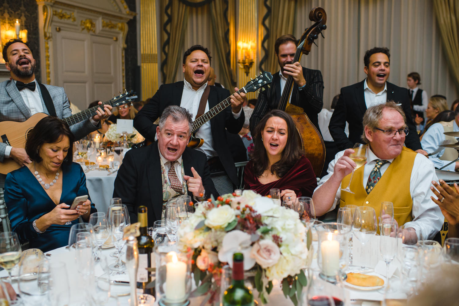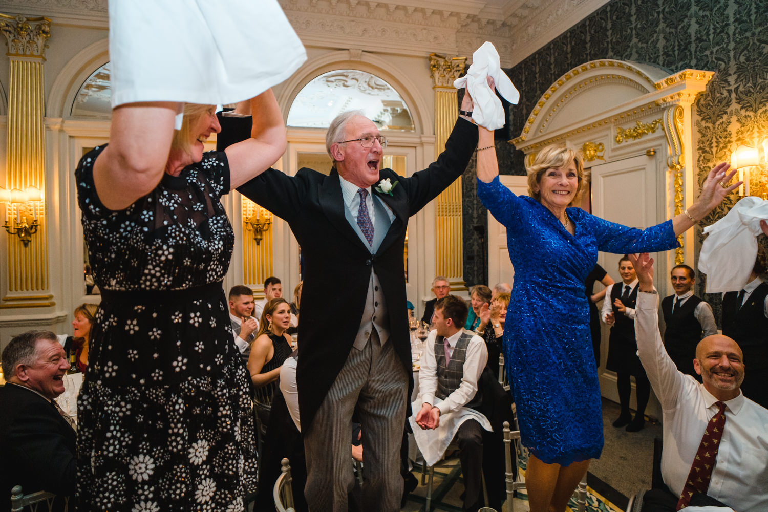 The rest of the celebrations were full of fun with some brilliant entertainment. During the wedding breakfast and speeches, a mobile band called The Troubadours had everyone up dancing between the courses. The energy in the room was fantastic, the guests were standing on chairs, dancing, singing and waving their napkins in the air. Both Sarah’s daughters deserve a special mention for their speech, and I also have to say that I loved their green dresses!