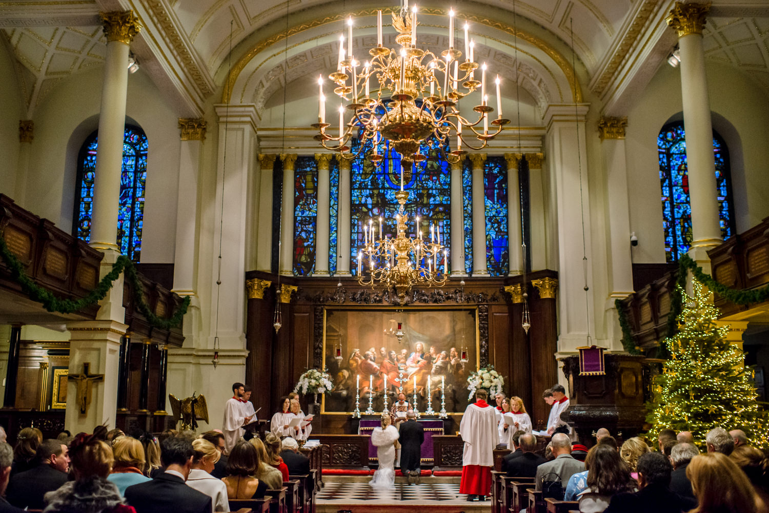 This was my second wedding at Claridge’s, and it’s becoming a firm favourite. I adore the classic art deco charm of the hotel. Sarah and Alistair also love the décor and explained that they chose the venue for its beautiful interior. After getting ready at Claridge’s, the bride and groom headed – separately, of course – to St George’s Church in Hanover Square for the ceremony. St George’s is a lovely old church and was dressed with gorgeous floral displays. Behind the altar is a stunning painting of the Last Supper.
